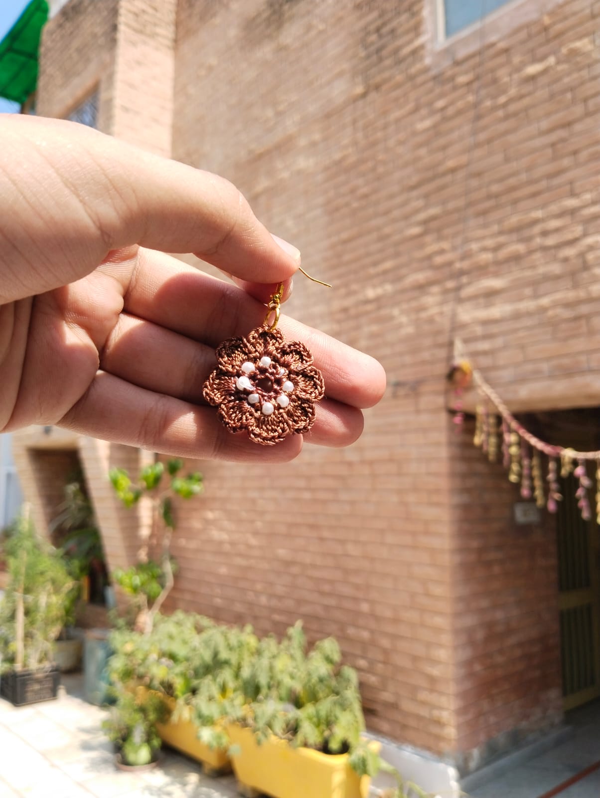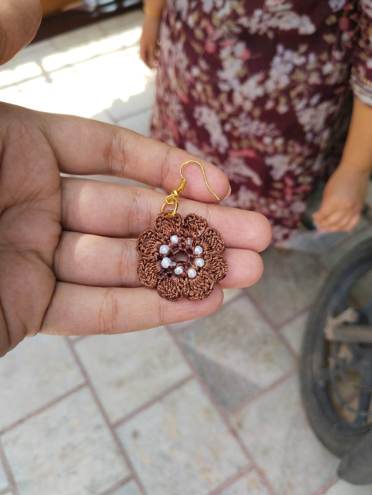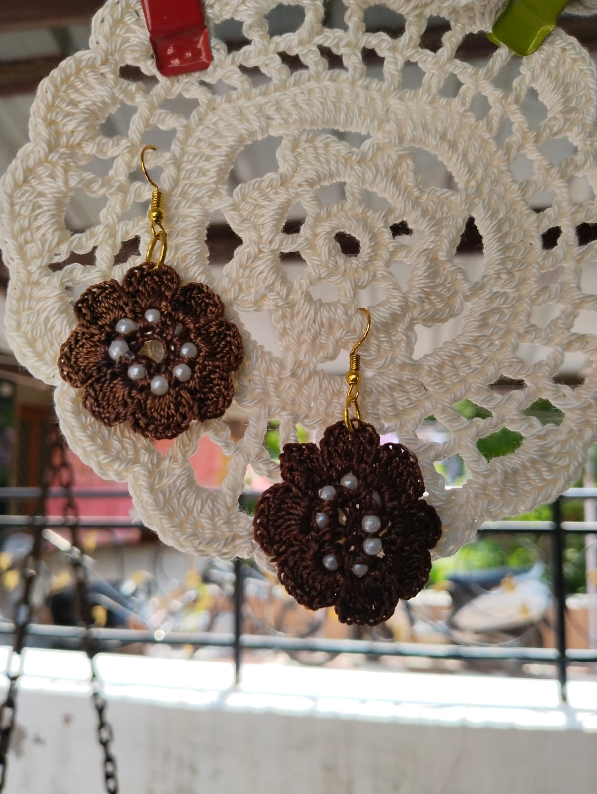 Handmade crochet earrings shaped like a delicate flower in rich brown, accented with white pearl beads in the center. These earrings combine earthy tones with a touch of elegance, making them perfect for both casual wear and festive occasions. Lightweight and handcrafted with care, they add a unique artisanal charm to your jewelry collection.