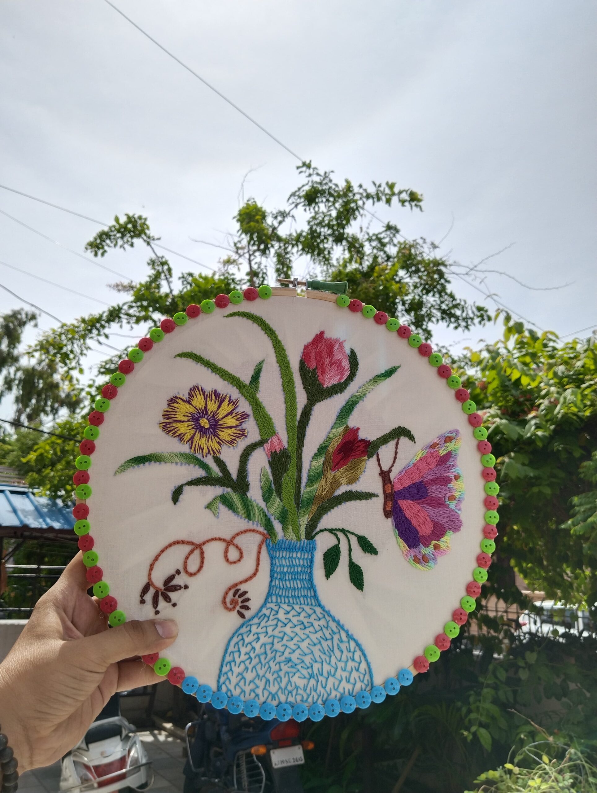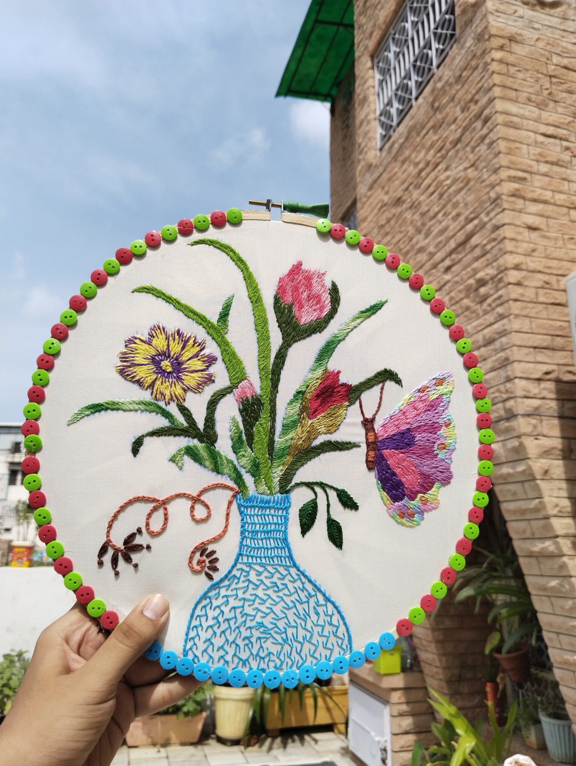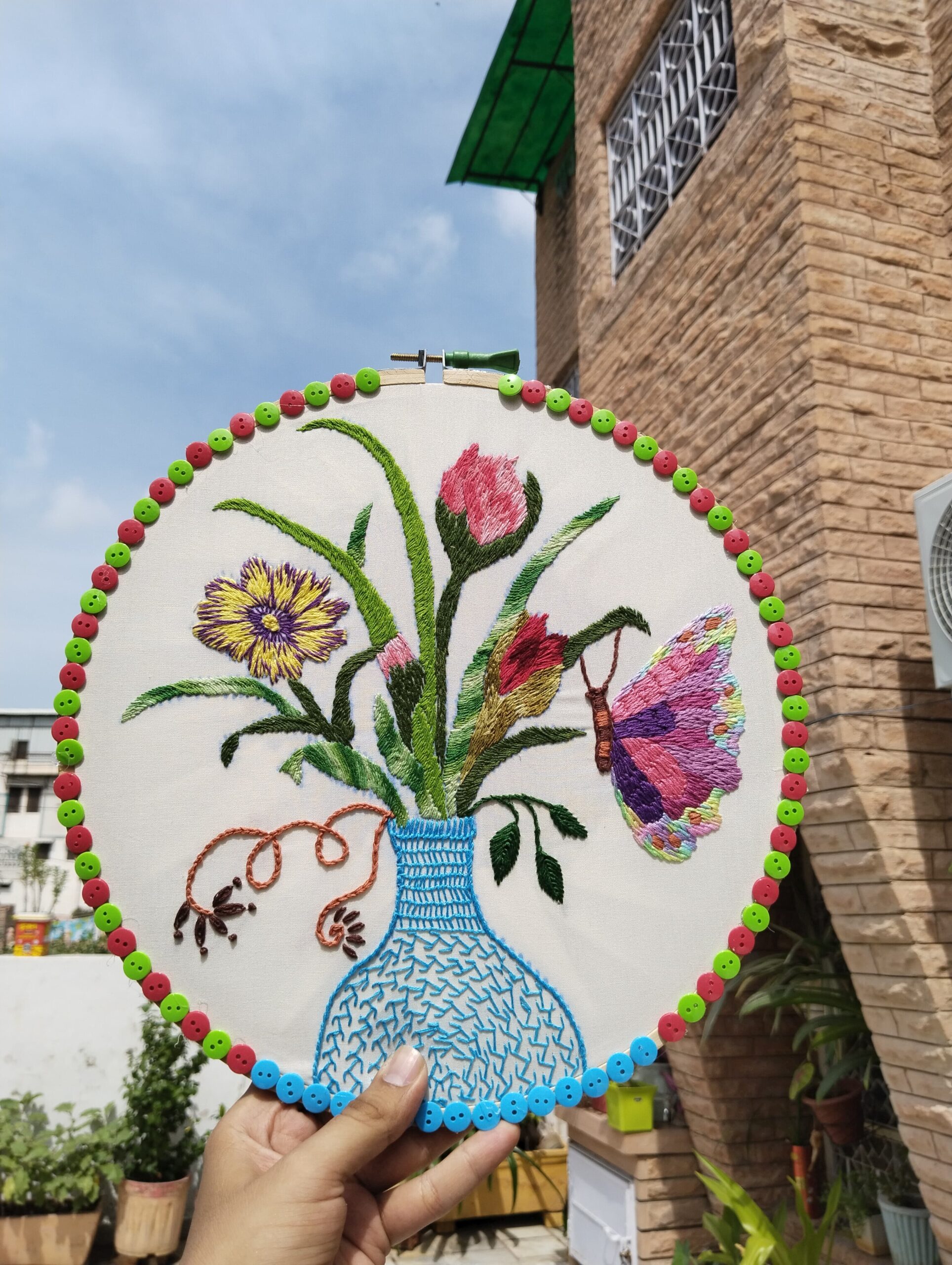 Bring home the charm of handcrafted elegance with our “Butterfly Bloom in Blue Vase” wall hoop. This stunning piece features intricate embroidery of blooming florals arranged in a delicately stitched blue vase, accompanied by a vibrant butterfly fluttering on the side.