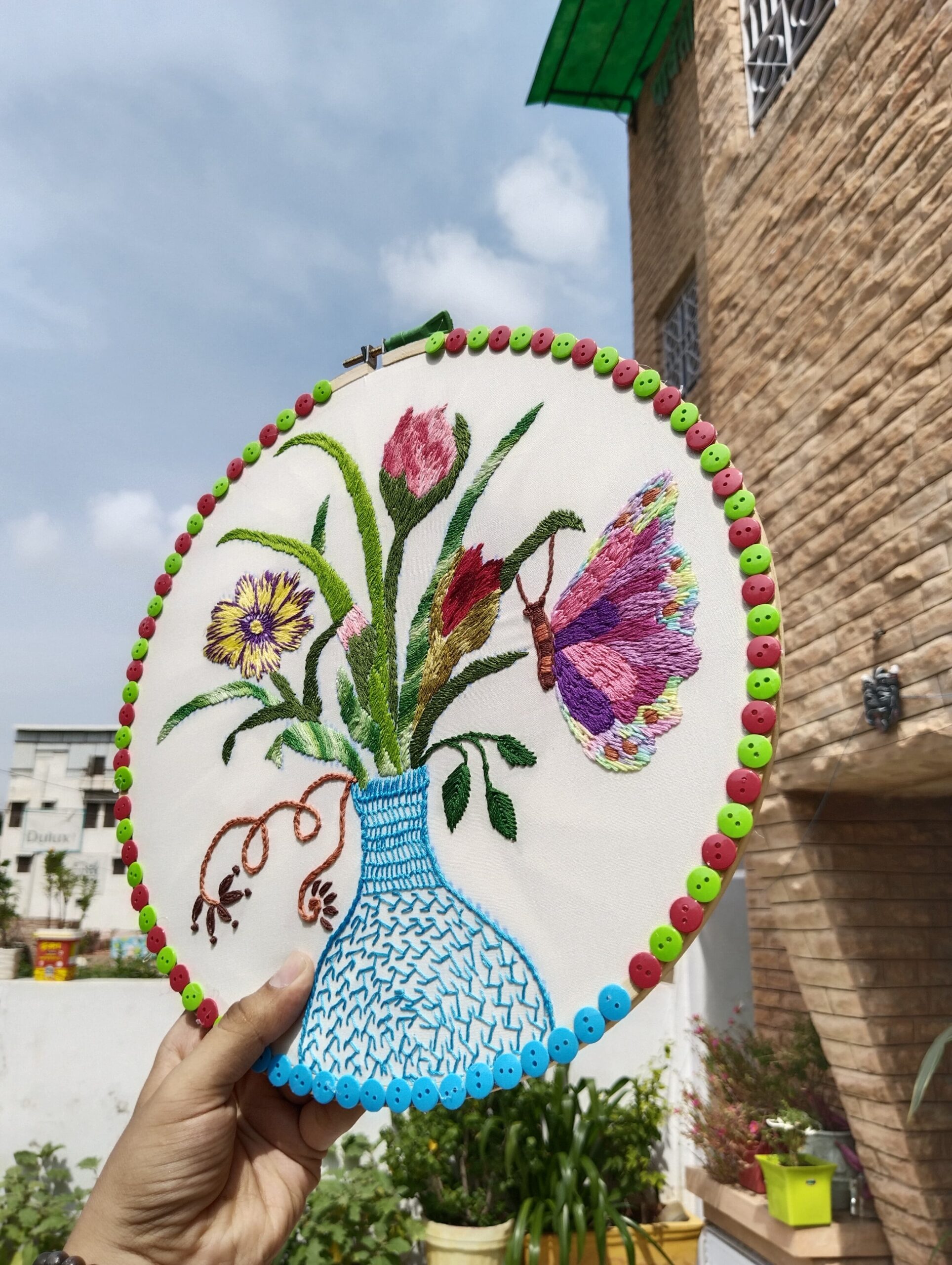 Handmade on premium fabric and adorned with cheerful red, green, and blue buttons around the hoop, it adds a pop of color and joy to any room. Whether hung in a living area, bedroom, or creative space, this piece brings warmth, artistry, and a touch of nature into your décor.