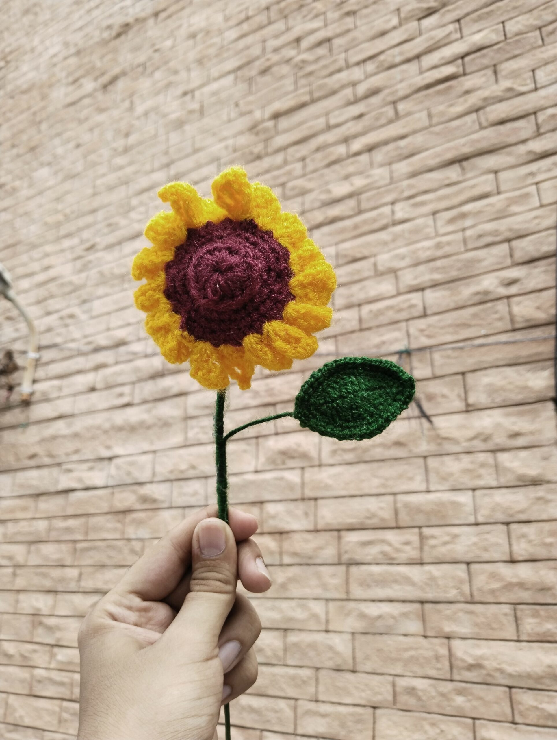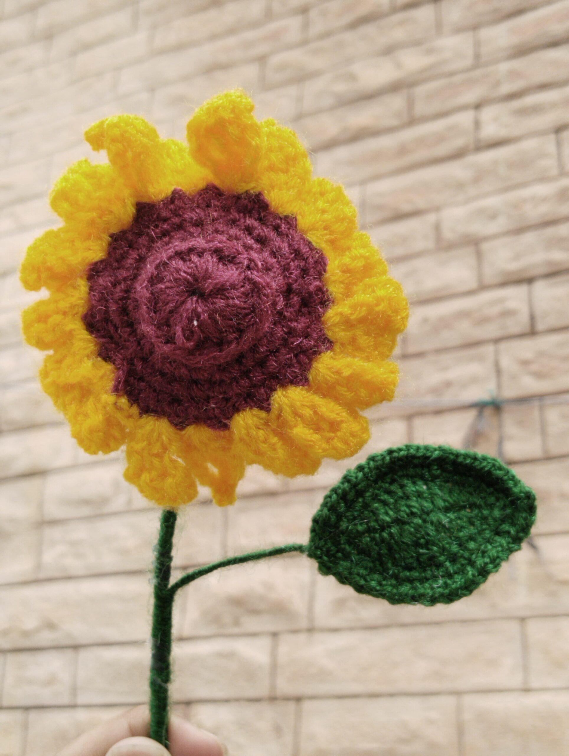 Made with vibrant golden-yellow and maroon yarn, each sunflower is carefully crocheted and shaped with a sturdy stem and green leaf. Whether displayed in a vase, used as festive decor, or gifted to someone special, these forever flowers add a cozy handmade touch that lasts.