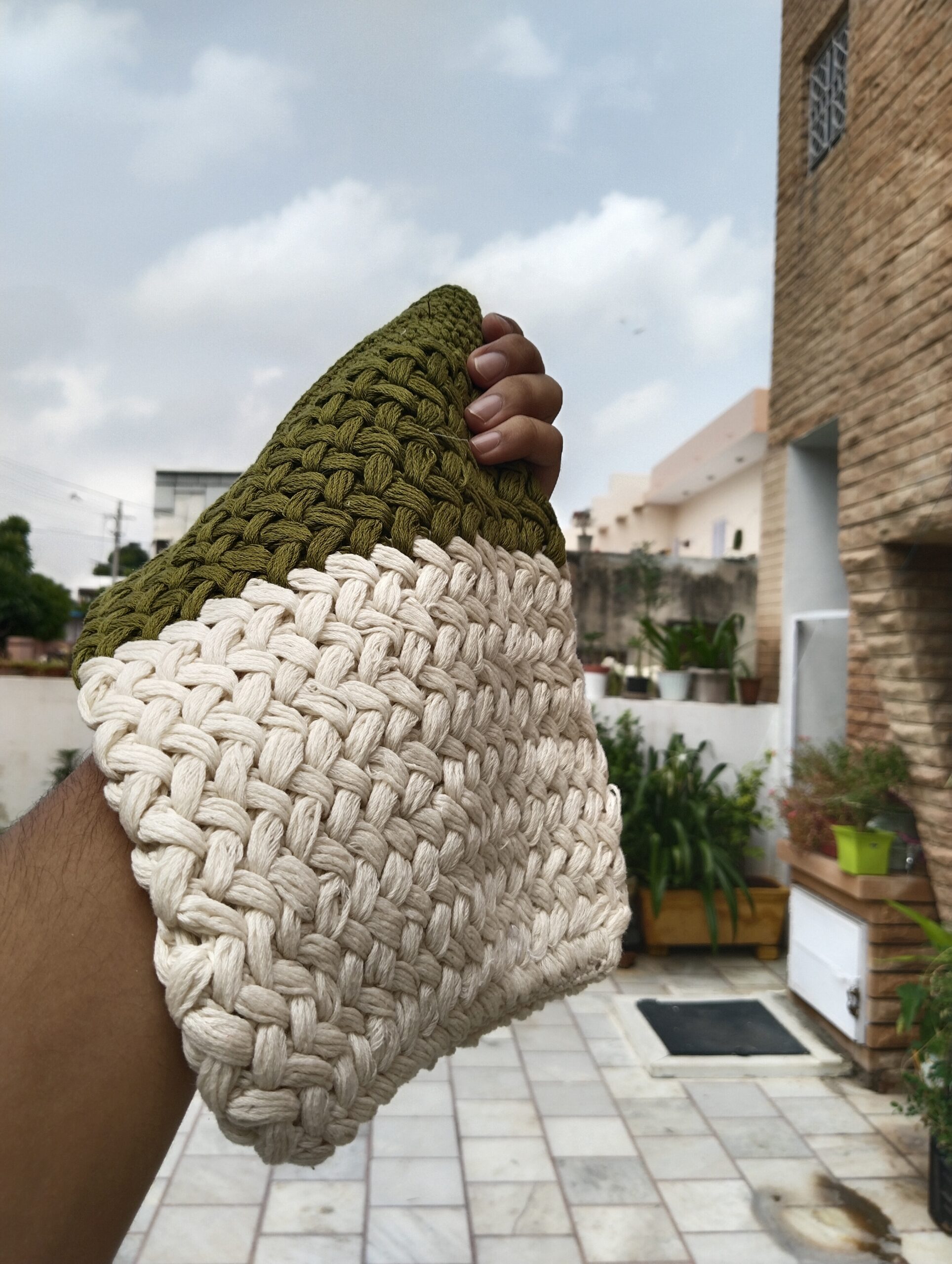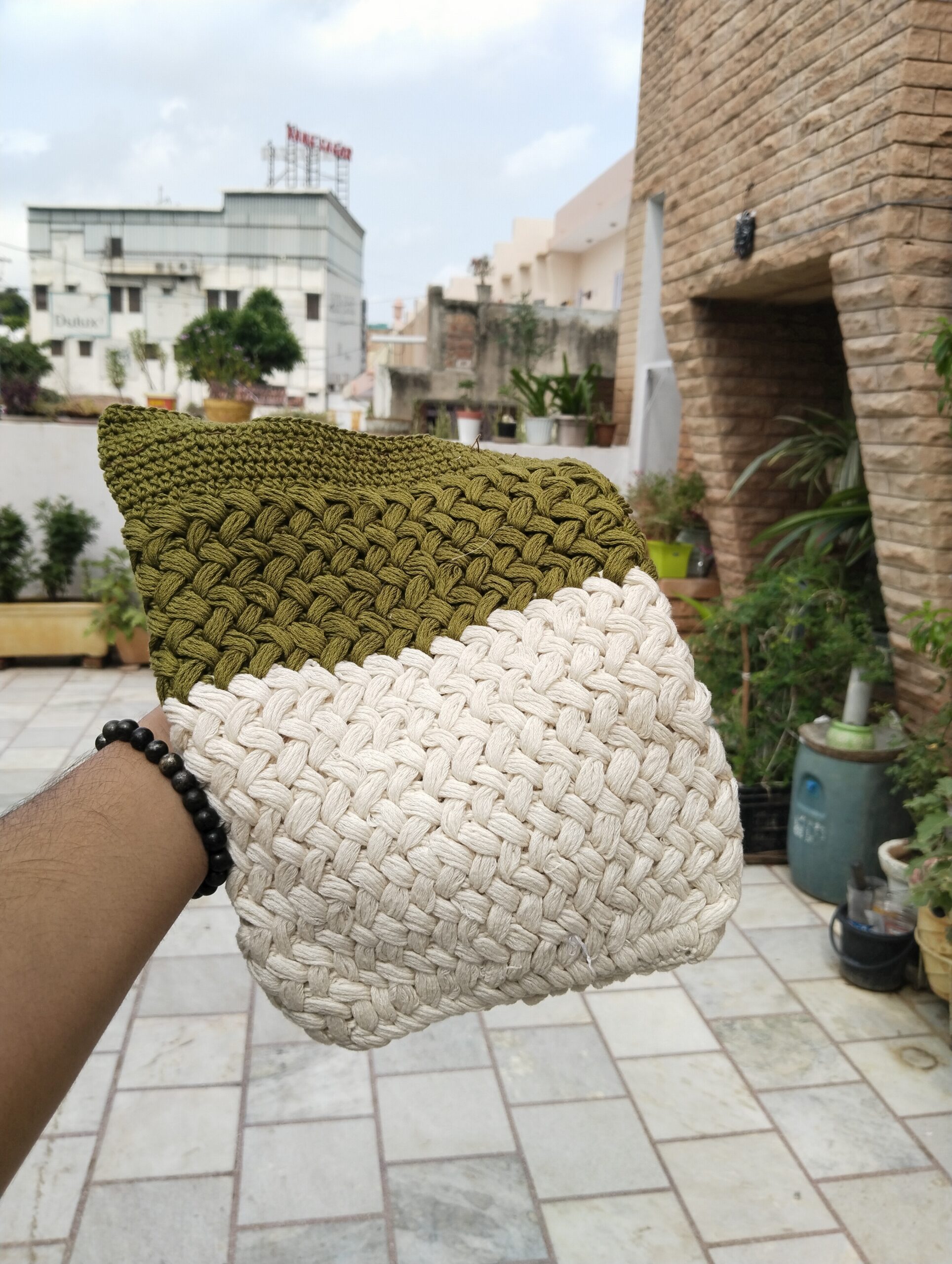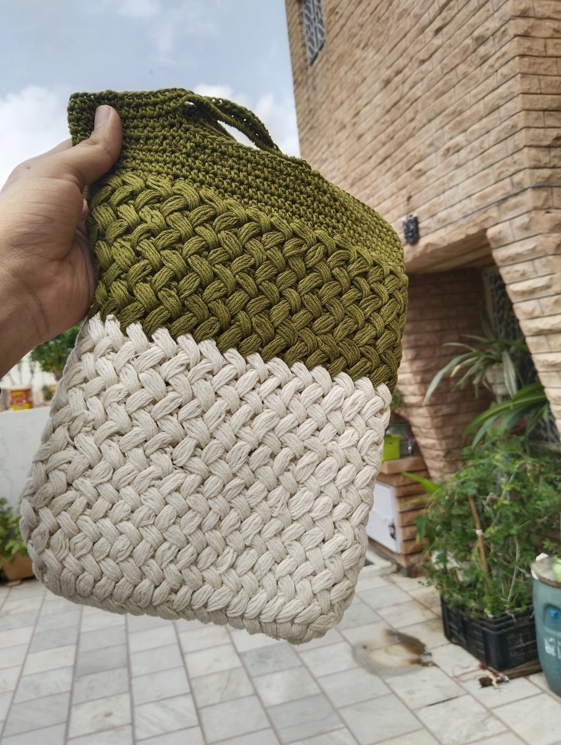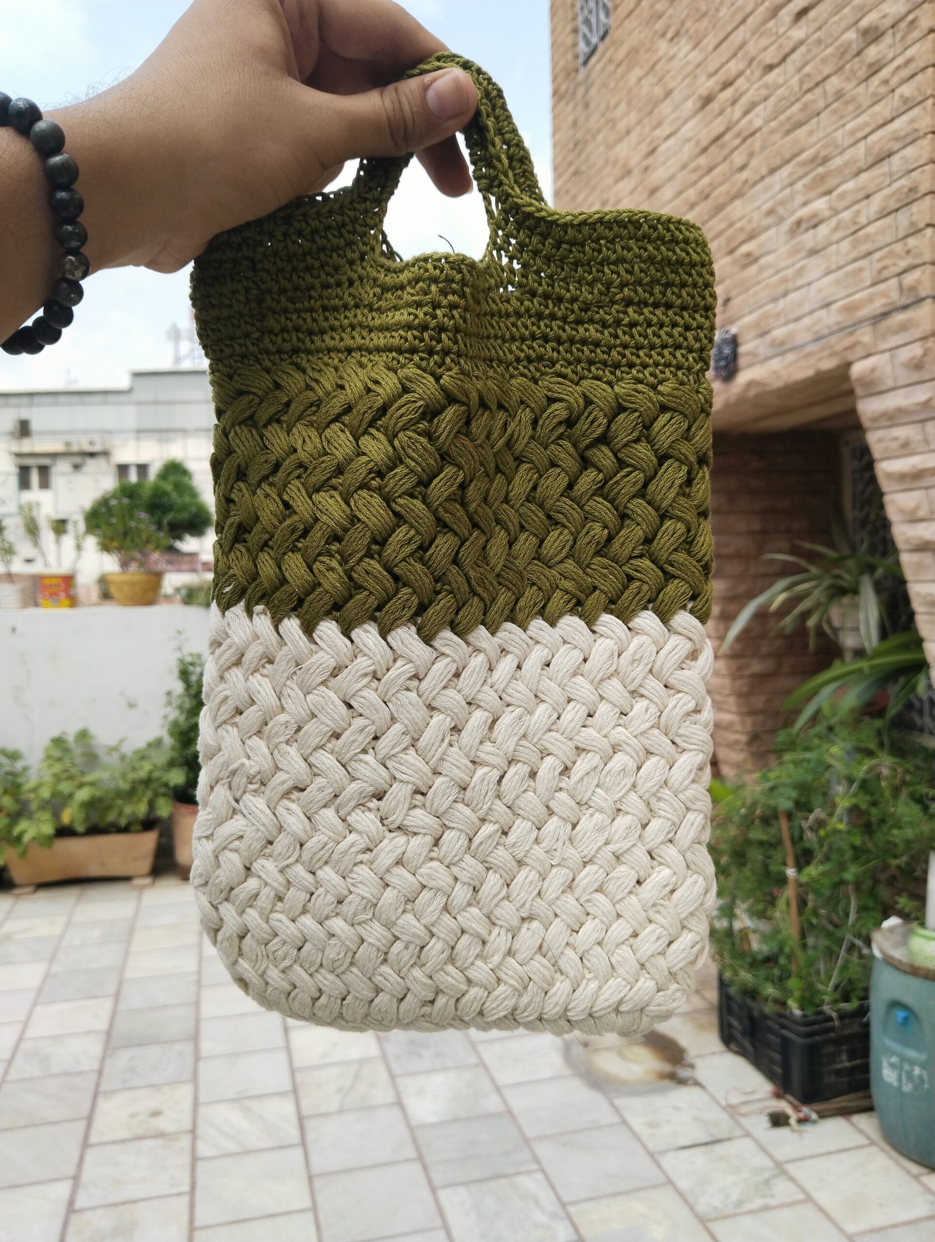 The Green-Cream Braided Crochet Tote is a statement piece crafted using premium chunky yarn in a stunning two-tone pattern. The bottom half in soft cream and the upper half in deep olive green are beautifully braided in a thick basket-weave style, giving it a sturdy yet flexible structure.