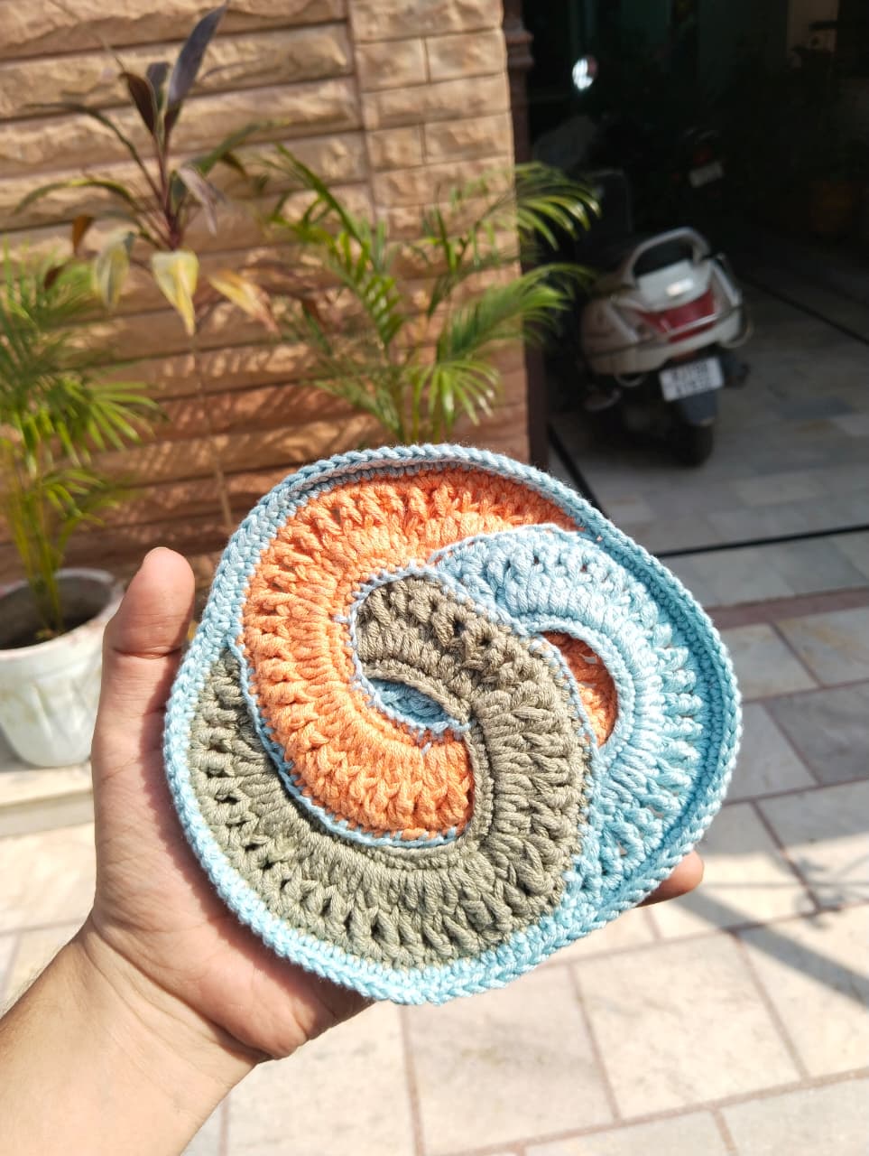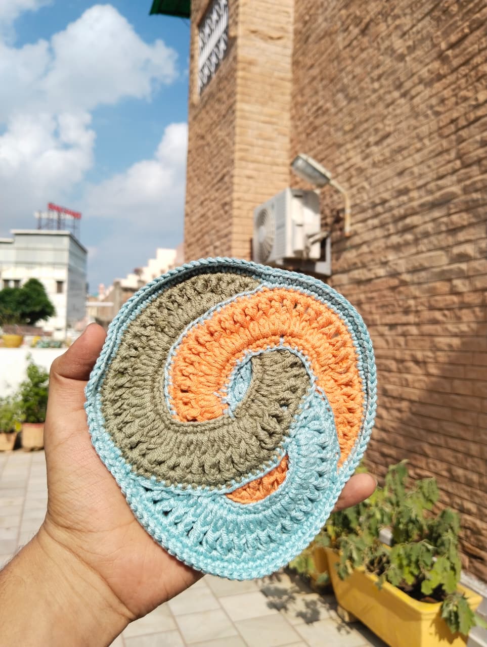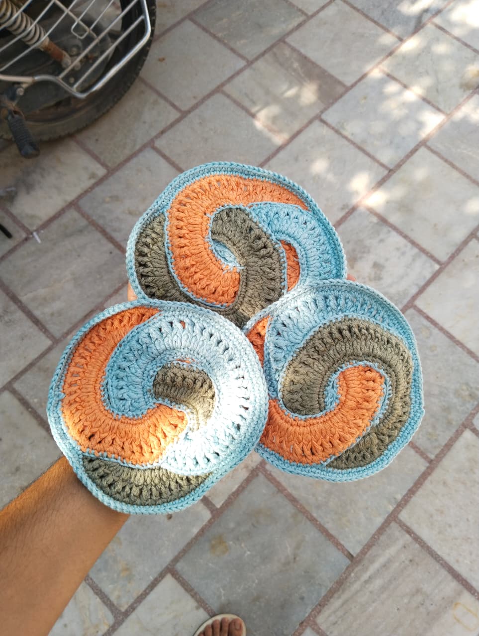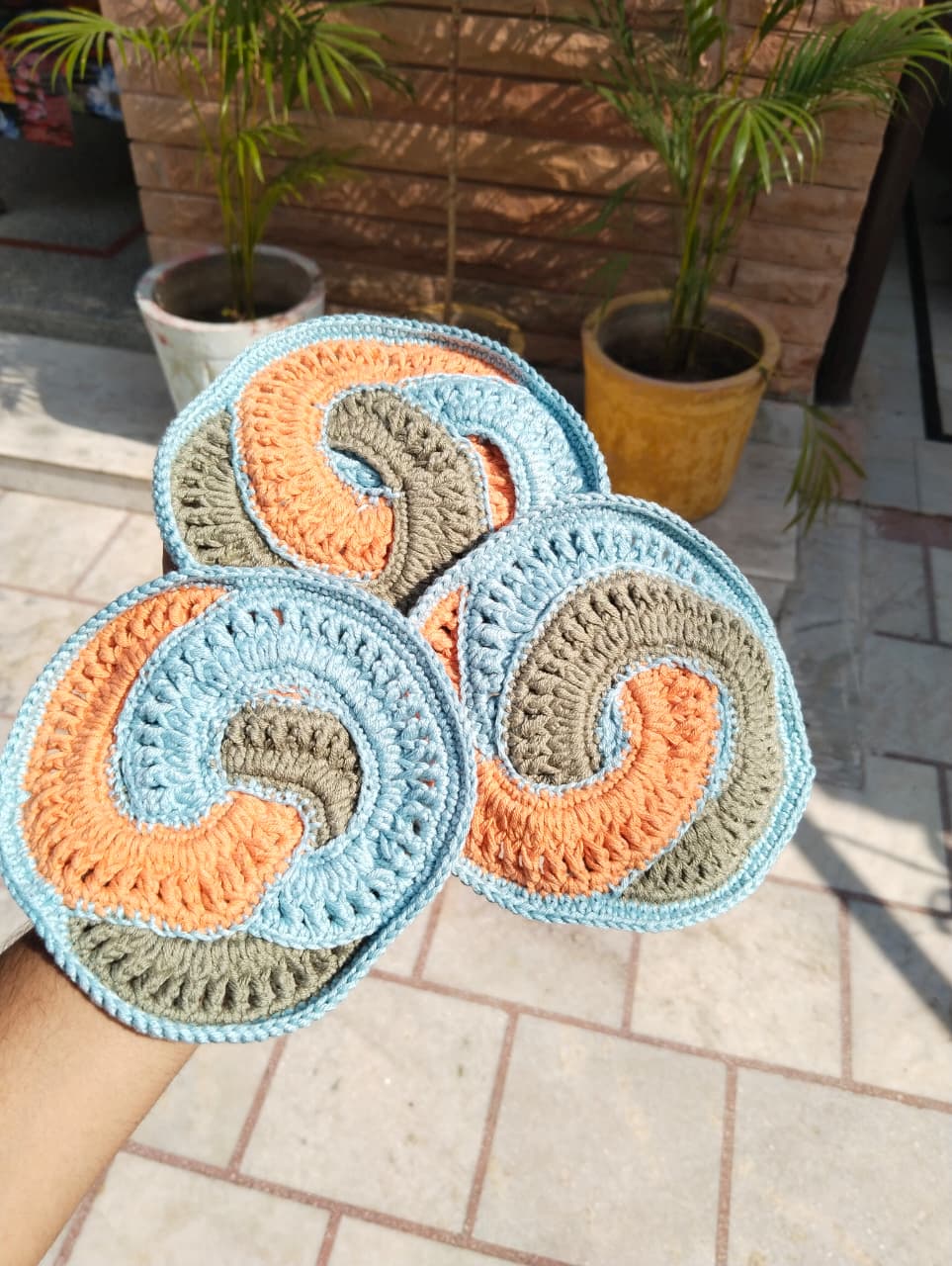 Add a modern twist to your table with our π Swirl Wave Crochet Coasters β Pack of 3. Each coaster is beautifully π§΅ handcrafted with 100% cotton yarn, featuring a vibrant swirl pattern of earthy orange π§‘, calm sky blue π, and natural olive green πΏ.